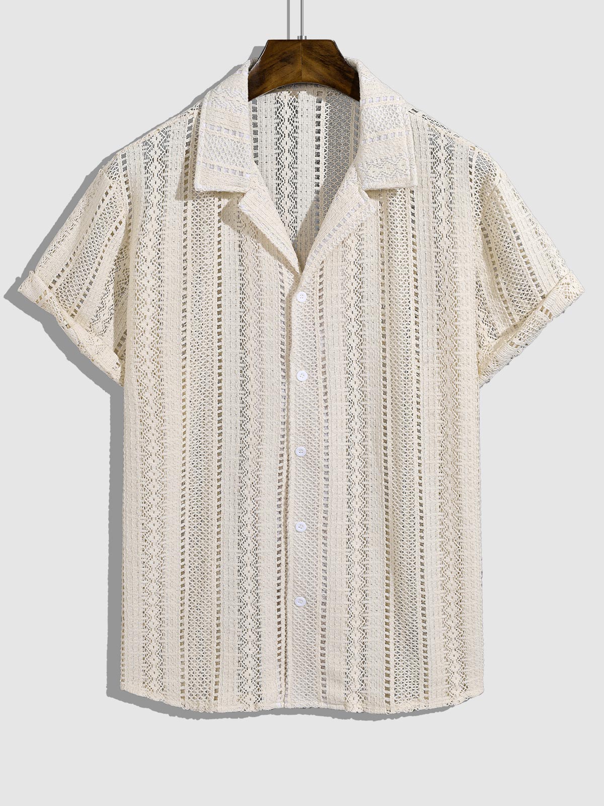 Men's Solid Color Hollow Cuban Collar Crochet Short Sleeve Shirt